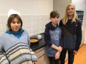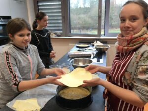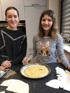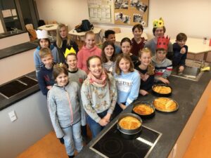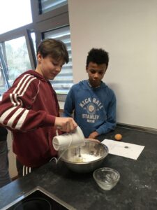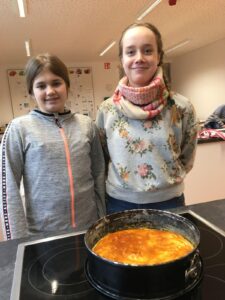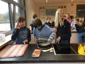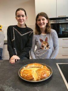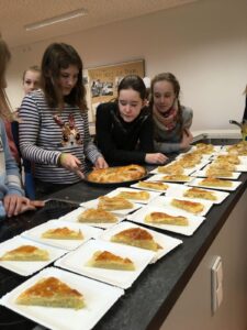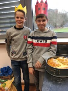 Am Dienstag, den 28.1. hat der französische Teil der Klasse 7FSb einen französischen Kuchen gebacken. Der Name dieser Köstlichkeit ist „Galette Des Rois“. Die Spanischgruppe des siebten Jahrgangs war eingeladen, mitzuessen. Die Galette hat ihren Namen vom heiligen Dreikönigsfest (galette = Kuchen – rois = König). In ihr findet man eine miteingebackene Porzellanfigur, allerdings nur eine pro Gallete. Wer diese in seinem Stück hat, ist König. Dieser bekommt dann eine Krone. Das gleiche wurde hier auch gemacht. Jeder bekam ein Stück Kuchen und wer eine Figur in seinem Stück hat, bekam eine Krone! Das Backen fand von der vierten bis zur sechsten Stunde statt und hat den Schülern eine Menge Spaß gemacht. Die Schüler hatten Backformen mitgebracht, während Frau Hühne Zutaten eingekauft und mitgebracht hatte. Die Geschichte hinter den „Galettes Des Rois“ ist hier nachzulesen.