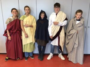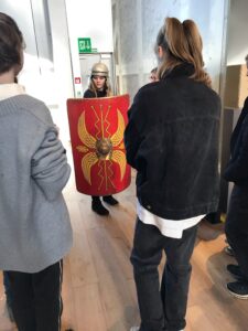 Der nächste Tag stand ganz im Zeichen des spannenden Römermuseums, in dem einige von uns in die Rüstung eines römischen Legionärs schlüpften, die feinen Kleider einer adeligen Römerin umlegten oder sich sogar in eine riesige Toga gehüllt als Senator präsentieren konnten. Später bastelten wir uns eigene „antike Schreibhefte“ in Form von Wachstäfelchen, die jede/r als kleines Andenken mit nach Hause nehmen konnte.