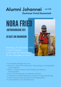 Endlich hieß es wieder „Alumni Johannei“ für Schüler*innen des 12. und 13. Jahrgangs. Die ehemalige Schülerin des Johanneums Nora Fried, Jahrgang 2011, berichtete von ihrem Werdegang nach dem Abitur, von ihrem Freiwilligen Ökologischen Jahr bis zur aktuellen Doktorarbeit. Ein spannender Einblick in das Leben nach dem Abschied vom Johanneum!