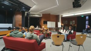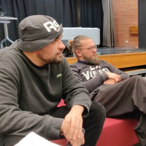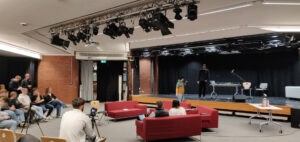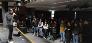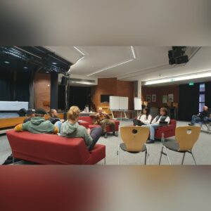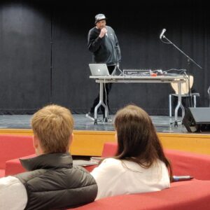Im Rahmen des Seminarfachs „Hip Hop als Spiegelbild oder Zerrbild der Gesellschaft“ haben 12. Klässler*innen die zwei Rapper Flowin’Immo (Bremen) und Sonne Ra (Erfurt) sowie den Kulturwissenschaftler Roger Behrens (Uni Hamburg) in unsere Aula eingeladen und über Authentizität im Rap gesprochen. Dabei wurden auch die Entwicklung von Hip Hop in West- und Ost-Deutschland sowie die Kontroverse um den wirtschaftlichen Sell-Out und den Inszenierungscharakter von Rap thematisiert. Im weiteren Gespräch, in dem auch die Zuschauer*innen eingebunden wurden, sprach man über die musikalische Emanzipation des Ostens, den Umgang mit Rassismuserfahrungen und dem existentiellen Drang, Musik machen zu müssen. Diese Energie wurde anschließend auf der Bühne vor Schüler*innen der Jahrgänge 9 bis 13 unter Beweis gestellt.