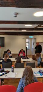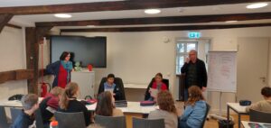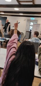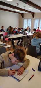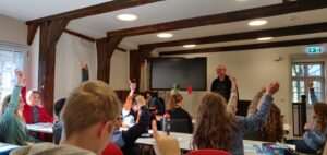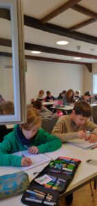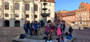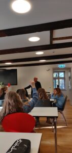 Wie erschaffe ich durch meine Fantasie eigene Welten? Dieser Frage ging die Klasse 5S2 im Rahmen des Lüneburger Lesefestes nach und besuchte den Hamburger Theaterautor Carsten Brandau in der Kinder- und Jugendbücherei der Ratsbücherei am Marktplatz. Die Schüler*innen lernten wie man große Gefühle wie Angst, Einsamkeit, Zuversicht und Glück in Worte fasst und dabei Geschichten entstehen. Hierzu erstellten sie ein Akronym aus ihren Namen und formulierten daraus unter Zeitdruck eine eigene Geschichte. Dabei stand der Schreibprozess und die Konzentration auf das Bauchgefühl (unser Sprachbauch) im Vordergrund. Zuletzt nutzte die Klasse gemeinsam eine Übung aus der Theaterwelt und erschufen innerhalb weniger Minuten ein kurzes, aber wirkungsvolles Drama.