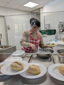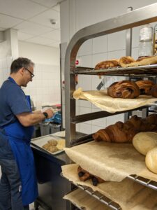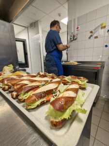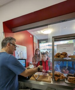 Schon ab 6.30 Uhr beginnt Herr Römer mit den Vorbereitungen für den Tag. Brötchen werden vorab gebacken, die Räumlichkeiten vorbereitet und der Kiosk aufgebaut. Unterstützt wird er von einem engagierten Team von 3-4 Kräften, die sowohl im Kiosk als auch im Innenraum der Mensa behilflich sind. Das täglich frisch gelieferte Essen wird von Herrn Römer und seinem Team liebevoll angerichtet und an die hungrigen Schüler*innen und Lehrkräfte ausgegeben.