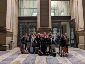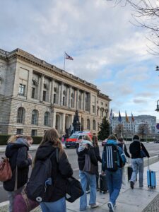 Bereits auf der Zugfahrt nach Berlin zeigte sich die Vorfreude der Schüler*innen, die sich lebhaft über die bevorstehenden Tage austauschten. Der Weg zum Hostel führte sie im Regen am Bundestag und durch das Brandenburger Tor, wo sie die politische Atmosphäre hautnah erleben konnten.