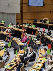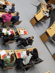 Die Schüler*innen nahmen ihre Rollen immer intensiver an, knüpften neue soziale Kontakte und vertieften ihre politischen Diskussionen in den Pausen. Am zweiten Tag arbeiteten sie in interfraktionellen Ausschüssen an einzelnen Themen, erhielten Besuch von Expert*innen und echten Abgeordneten, die ihre Erfahrungen teilten. In lebhaften Debatten im Abschlussplenum wurden Ausschussempfehlungen diskutiert und Änderungsanträge vorgestellt. Themen wie die Beziehungen der EU mit der Volksrepublik China und die Zukunft der Europäischen Union standen im Fokus.