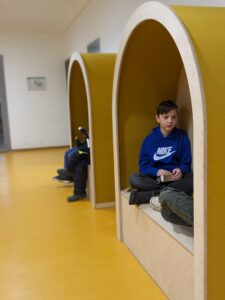 Heimatbereiche in einheitlichen Farben: Die Heimatbereiche wurden nicht nur aus einem ästhetischen Gesichtspunkt heraus neu gestaltet, sondern auch, um den Schülern Rückzugsmöglichkeiten zu bieten. Die Integration von Podesten ermöglicht es den Schülern sogar, im Knien oder Liegen zu arbeiten, während die flexiblen Hokkis auch auf den Freiflächen im Heimatbereich genutzt werden können.