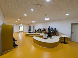 Gruppenräume mit modernen Lerninseln: Der erste Gruppenraum wurde ebenfalls einer Transformation unterzogen, um optimale Lernumgebungen zu schaffen. Jeder Raum beherbergt nun zwei Lerninseln, die durch trennende Wände einen individuellen Arbeitsraum bieten. Barhocker an den breiten Fensterbänken und die geplante Integration von Schließfächern für iPads unterstreichen die fortschrittliche Ausstattung. In den größeren Gruppenräumen ist außerdem Barrierefreiheit gewährleistet.