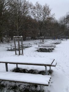Noch sind es 16 Tage bis zu den Winterferien und unsere Schule erstrahlt schon in winterlichem Glanz. Auch wird der gefallene Schnee produktiv für Unterrichtszwecke genutzt, auf den Fotos ist „Geschichtsunterricht mal anders“ mit der Dolchstoßlegende zu sehen.