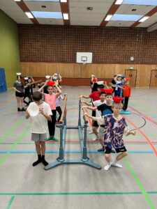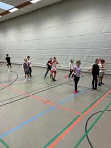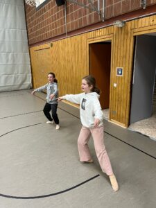 Ein Ballett ist eine Geschichte, die durch Musik und Tanz erzählt wird. Dazu kommen grazile Bewegungen und ist eigentlich ein echtes Kraftworkout! Die beiden Schülerinnen demonstrierten dies eindrucksvoll und versetzen die Klasse in Erstaunen. Jegliche Vorurteile waren schnell vergessen. Was diesen speziellen Sportunterricht besonders machte, war sowohl die unerwartete Vorführung als auch die aktive Beteiligung der gesamten Klasse. Unter der Anleitung von Amelie und Maria tauchten die Schüler*innen konzentriert in die Welt des Balletts ein. Es war erfreulich zu beobachten, wie die Klasse enthusiastisch und engagiert die neue Herausforderung annahm.