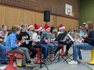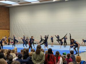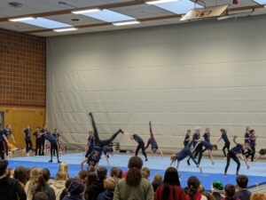 Ein spannendes Quiz der Klasse 7S2 sorgte für knifflige Unterhaltung, gefolgt von einer beeindruckenden Bodenakrobatik der Akrobatik-AG. Die Ukulelen-AG präsentierte im ersten Teil ihres Auftritts besinnliche Melodien, bevor die Klasse 6S1 mit ihrer Step-Action die Bühne rockte. Nach einem weiteren Stück der Band-AG wurde das Publikum durch den Mitmach-Tanz der Klasse 6FL aktiv eingebunden und zum gemeinsamen Tanzen animiert.