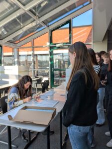 Zu Beginn besuchten die Klassenlehrerinnen und -lehrer sowie die Politikfachlehrer gemeinsam mit einzelnen Klassen das Wahlbüro. Dort wurde zunächst die Anwesenheit kontrolliert und die Identität der Wahlberechtigten mittels Ausweisdokument überprüft. Anschließend erhielten die Schülerinnen und Schüler ihre persönlichen Wahlzettel und Wahlscheine. Danach folgte der spannende Moment: Hinter zwei Wahlkabinen konnten sie ihre beiden Stimmen – die Erststimme und die Zweitstimme – abgeben. Dieser Ablauf unterstrich nicht nur die Ernsthaftigkeit der Wahl, sondern bot auch einen praxisnahen Einblick in das demokratische Verfahren.