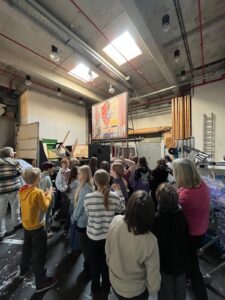 Mit großen Augen und vielen neugierigen Fragen erkundeten unsere Schüler*innen die verborgenen Bereiche des Theaters: die riesige Bühnenmaschinerie, den Fundus mit unzähligen Kostümen, Requisiten und die beeindruckenden Werkstätten. Dabei wurde deutlich: Im Theater arbeiten weit mehr Menschen als nur die, die man später auf der Bühne sieht. Maskenbildner*innen, Lichttechniker*innen, Schneider*innen – viele spannende Berufe gaben einen Einblick in die Welt hinter dem Vorhang.