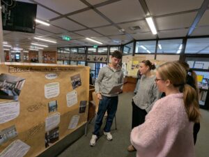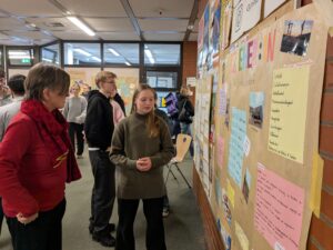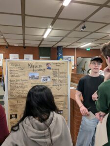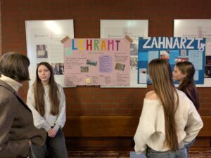 Erst im Februar waren die Elftklässler*innen zwei Wochen lang in ganz unterschiedlichen Bereichen unterwegs – vom Journalismus bis zum Gartenbau, von der Pflege über das Handwerk bis hin zu kaufmännischen Berufen oder auch ungewöhnlicheren Feldern wie der Bestattung. Mit Plakaten, Präsentationen und vor allem vielen persönlichen Gesprächen boten sie nun einen authentischen Einblick in ihre Praktikumserfahrungen. Dabei stellten sie nicht nur die Berufe, sondern auch Ausbildungs- und Studienwege, Verdienstmöglichkeiten, Entwicklungsperspektiven und die jeweiligen Betriebe vor.