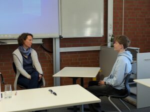 Am Zukunftstag selbst konnten sie das Erlernte auf besondere Weise vertiefen: Frau Leupold, Personalverantwortliche und Mutter einer Schülerin, nahm sich viel Zeit, um die erarbeiteten Bewerbungsmappen professionell zu begutachten. Mit ihrer langjährigen Erfahrung gab sie wertvolles Insiderwissen weiter, das den Schüler*innen direkte Einblicke in die Sichtweise einer Personalabteilung ermöglichte. Besonders hilfreich waren dabei ihre individuellen Rückmeldungen und zahlreichen Tipps zur Optimierung. Ein weiterer Schwerpunkt des Tages lag auf der Simulation von Bewerbungsgesprächen, die Frau Leupold ebenfalls leitete. In kleinen Gruppen erprobten die Schüler*innen authentische Gesprächssituationen und sammelten so wichtige erste Erfahrungen im Vorstellungsgespräch – eine ideale Vorbereitung auf das Bewerbungsverfahren für das Praktikum in Klasse 11, das bereits im kommenden Jahr beginnt.