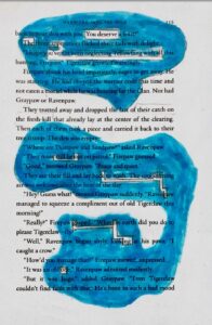 Nach der Lektüre wurde das Gelesene auf besondere Weise verarbeitet: Mit der Methode der Blackout Poetry gestalteten die Schülerinnen und Schüler eigene Gedichte – direkt aus den Buchseiten. Dabei wurden bestimmte Wörter hervorgehoben, alles andere geschwärzt, um neue, poetische Texte entstehen zu lassen, die zum Inhalt oder zur Stimmung der Geschichte passten.
