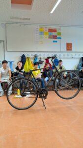 Zu Beginn der 4. Stunde wurde ein leicht beschädigtes Fahrrad in die Mitte der Klasse gestellt. Uns wurde erklärt, dass es bestimmte Gesetze gibt, wie ein Fahrrad oder Auto gebaut sein muss. Zum Beispiel, dass Bremsen und Licht vorhanden sein müssen. Dann haben wir überprüft, ob das Fahrrad alle Anforderungen erfüllt (es hat aber nicht alle erfüllt). Im Anschluss wurde ein Helm herumgegeben, der einem Menschen das Leben gerettet hat. Wir haben darüber gesprochen, dass manche Leute keinen Helm tragen, weil sie denken, das sei cool. Ich würde persönlich lieber eine Helmfrisur als eine Schädelfraktion haben!