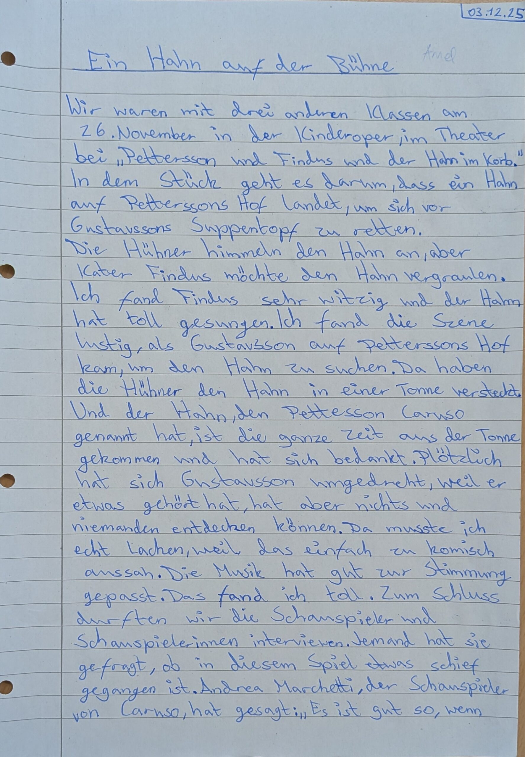 Im Theater wurden die Klassen herzlich begrüßt und nahmen gespannt Platz. Das Stück erzählt – ganz nach den beliebten Büchern von Sven Nordqvist – die turbulente Geschichte rund um Petterssons Kater Findus, der plötzlich von einem selbstbewussten Hahn herausgefordert wird. Mit viel Musik, Slapstick und liebevollen Figuren erlebten die Kinder, wie Findus versucht, seinen Platz im Haus zu verteidigen – und Pettersson einmal mehr zwischen Chaos und Freundschaft vermitteln muss. Die Inszenierung überzeugte mit einer fröhlichen Bühne, eingängigen Liedern und charmanten Darsteller*innen, die das Publikum sofort mitrissen.