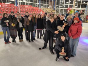 20 Schüler*innen aus den Volleyball- und Mathe-Kursen von Frau Seitz in Jahrgang 12 versammelten sich bei frühlingshaften Außentemperaturen, aber drinnen bei dann doch zur Zeit ungewohnt frostiger Atmosphäre in der Eishalle in Adendorf zum Eisstockschießen als vorweihnachtlichem Abschluss des Semesters. Beim Probewerfen der Eisstöcke zur Eingewöhnung näherten sich noch wenige der sogenannten Daube, dafür aber der Eisfläche durchs Ausrutschen mit Landung auf dem Hosenboden, doch im Turnierverlauf im Jeder-gegen-jeden-Modus waren dann bei allen vier Teams deutliche Verbesserungen in der Wurftechnik zu sehen. So wurde doch ein ums andere Mal der Zollstock zum Messen gebraucht, viel gelacht und mitgefiebert. Die Tutoren Frau Krekeler und Herr Hartmann unterstützten auch zwei Teams, aber die siegreiche Mannschaft im Vordergrund des Gruppenfotos kam ohne Lehrkraft aus und brachte wohl die richtige Mischung aus mathematischer Berechnung und Sportsgeist mit. Ein schöner Abend, der nur mit etwas kalten Füßen endete – vielleicht gibt es ja im kommenden Jahr eine Neuauflage …