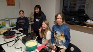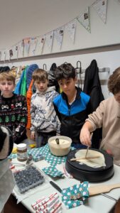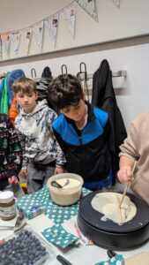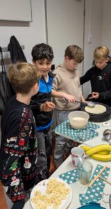 Die Klasse 5S1 hat eine stimmungsvolle Weihnachtsfeier im Klassenraum veranstaltet. Mit viel Engagement hatten die Schülerinnen und Schüler den Raum festlich dekoriert und verschiedene Weihnachtsstände aufgebaut. Das Angebot war vielfältig: Es gab einen Crêpe-Stand, einen Stand mit Waffeln und Popcorn, einen Stand mit Schokofrüchten und Zuckerwatte sowie einen Stand mit wärmendem Apfelpunsch. Kreativ wurde es beim Basteln kleiner Lebkuchenhäuschen, und für Spaß sorgte ein Stand mit Dosenwerfen.