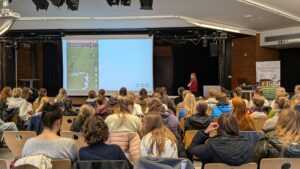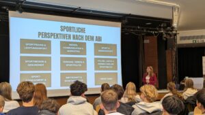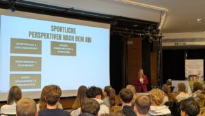 In ihrem Vortrag zeigte sie auf, wie unterschiedlich berufliche Wege im Sport aussehen können. Anhand eigener Erfahrungen sprach sie über die Schiedsrichterei, über Coaching- und Traineraufgaben sowie über Tätigkeiten im Sportmanagement, in den Medien, in der Datenanalyse oder in der Physiotherapie. Dabei wurde deutlich, wie breit das Berufsfeld Sport tatsächlich aufgestellt ist. Hanna machte zudem anschaulich, welche Fähigkeiten im Sportalltag eine zentrale Rolle spielen. Sie sprach darüber, wie wichtig klare Entscheidungen, gute Kommunikation und der Umgang mit Stress sind, aber auch darüber, wie Konflikte gelöst werden können und warum Verantwortung, Führung und Fairness unverzichtbar sind — auf dem Platz und darüber hinaus.