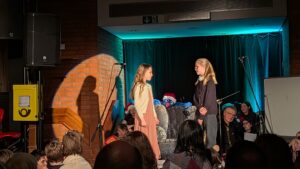 Schon vor dem Betreten der Aula lag Weihnachtsstimmung in der Luft. Schülerinnen und Schüler des 13. Jahrgangs sorgten draußen mit Waffeln und einem Popcornwagen für einen verlockenden Duft und eine rundum gelungene kulinarische Einstimmung, während sich drinnen Band, Chor und Technik-AG auf den Abend vorbereiteten. Die Technik-AG schuf mit Licht und Ton einen stimmungsvollen Rahmen, der das Konzert perfekt ergänzte.