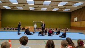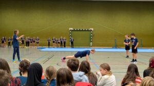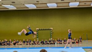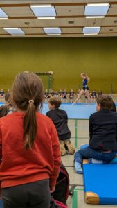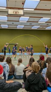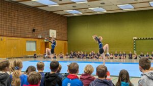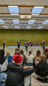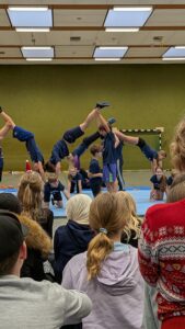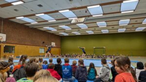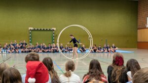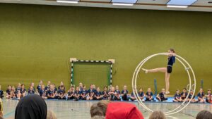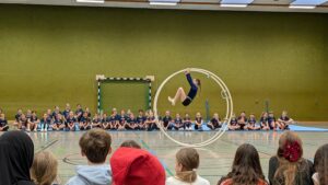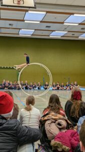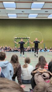 Sportlich, dynamisch und eindrucksvoll ging es mit der Akrobatik-AG weiter, die zunächst eine Seilspring-Choreografie präsentierte. Es folgten weitere Highlights aus dem Bewegungsbereich: ein Rhönrad-Beitrag von Sophie (6S1), Ropeskipping von Johanna und Lara (8S2 und 6S1) sowie später spektakuläre Menschenpyramiden der Akrobatik-AG. Auch jahrgangsübergreifend wurde das Programm bereichert – mit einer Turneinlage von Megan (Jg. 12) und Lilly (11F1), die zeigte, wie selbstverständlich ältere Schüler*innen Teil dieses Gemeinschaftsfestes waren.