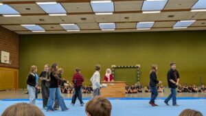 Fürs Köpfchen sorgte das Weihnachtsquiz der Klasse 8S2, bei dem mit viel Begeisterung mitgeraten wurde. Gesucht wurde die „klügste Weihnachtsklasse“ – und der Wanderpokal ging in diesem Jahr an eine 5. Klasse, die sich besonders quizstark zeigte. Ein weiteres kreatives Highlight war das weihnachtliche Theaterstück der Klasse 6L2, das mit viel Spielfreude und Humor das Publikum begeisterte.