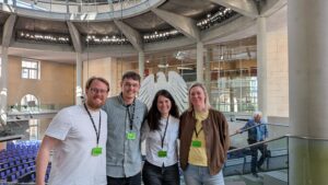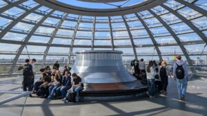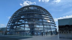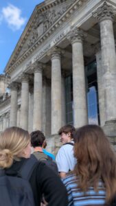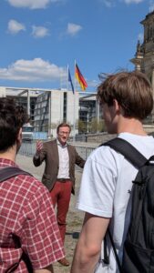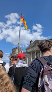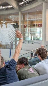 Im Anschluss führte der Weg zum Deutschen Bundestag. Zwar wurde die laufende Debatte im Plenum knapp verpasst, dennoch bot der Besuch des Reichstagsgebäudes den Schülerinnen und Schülern wertvolle Einblicke in das Innere des Bundestags und die politische Bedeutung dieses besonderen Ortes. Auch der Blick von der Kuppel auf das politische Berlin beeindruckte die Gruppe sehr und rundete diesen Programmpunkt eindrucksvoll ab.