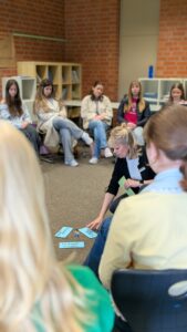 Am Zukunftstag selbst konnten sie das Erlernte auf besondere Weise vertiefen: Frau Leupold als Personalverantwortliche nahm sich viel Zeit, um die erarbeiteten Bewerbungsmappen professionell zu begutachten. Mit ihrer langjährigen Erfahrung gab sie wertvolles Insiderwissen weiter, das den Schülerinnen direkte Einblicke in die Sichtweise einer Personalabteilung ermöglichte. Besonders hilfreich waren dabei ihre individuellen Rückmeldungen und zahlreichen Tipps zur Optimierung. Ein weiterer Schwerpunkt des Tages lag auf der Simulation von Bewerbungsgesprächen, die Frau Leupold ebenfalls leitete. In kleinen Gruppen erprobten die Schülerinnen authentische Gesprächssituationen und sammelten so wichtige erste Erfahrungen im Vorstellungsgespräch – eine ideale Vorbereitung auf das Bewerbungsverfahren für das Praktikum in Klasse 11, das bereits im kommenden Jahr beginnt.
