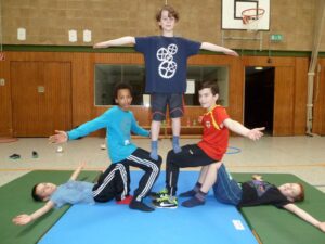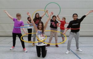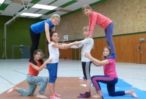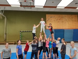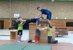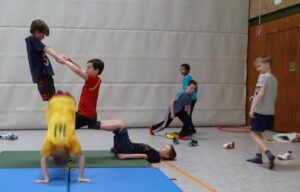Obwohl zur Zeit fast nur Kinder aus dem 5. und 6. Jahrgang der Akrobatik-Gruppe angehören, sind auch Schülerinnen und Schüler des 7. Jahrgangs herzlich eingeladen, an dieser sehr vielseitigen AG teilzunehmen.