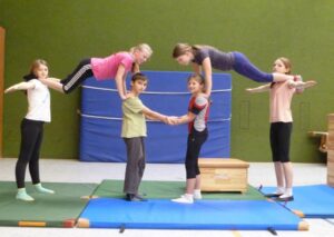 Die Inhalte dieser Sport-AG sind sehr vielfältig: Neben dem Bauen von Menschenpyramiden üben wir auch turnerische Elemente am Boden oder an verschiedenen Geräten. Besonders beliebt ist dabei das Springen mit dem kleinen oder auch großen Trampolin. Des Weiteren erarbeiten wir „Kunststückchen“ mit Kleingeräten, wie z.B. Moonhopper, Springseil, Gymnastikband oder Reifen. Ebenso können auch Tänze auf dem Programm stehen. Nicht zu vergessen sind die Spiele, die einen festen Bestandteil jeder Übungsstunde darstellen.