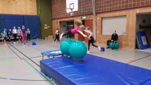 Mädchen und Jungen vorwiegend der Jahrgangstufen 5 und 6 in der Sporthalle des Johanneums zur Akrobatik-AG.